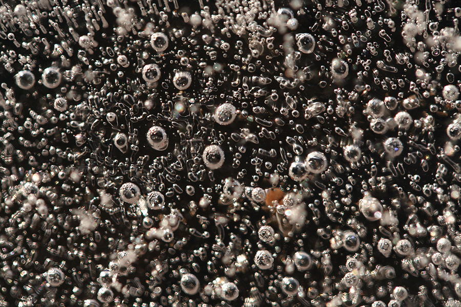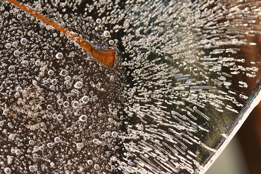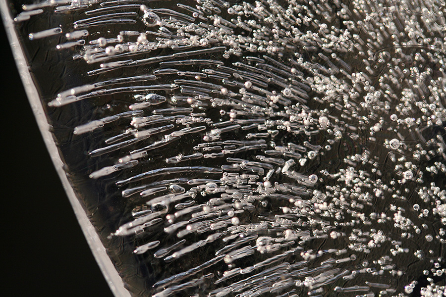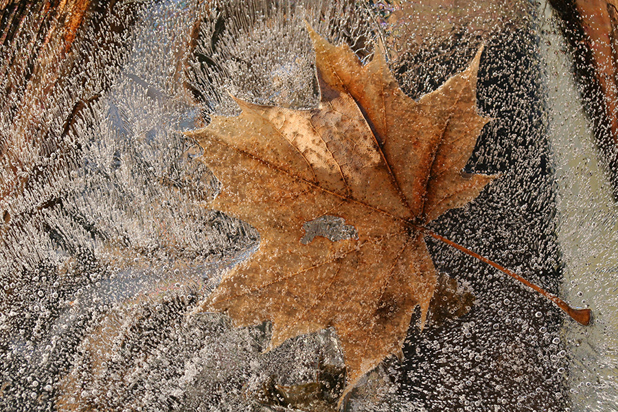 walking around the backyard, i found a thin disc of ice frozen on top of a plastic bucket lid. it was full of ice bubbles and a maple leaf was frozen inside as well.