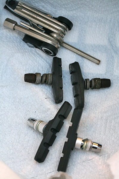the back brakes were a little more difficult. there's uneven tension on the brake arms (these are v-brakes AKA linear-pull brakes) so that one pad sticks to the rim while the other one pulls away. when i increased the tension on the weaker arm, it went lopsided again, this time the other side was sticking. finally i came up with a solution: increase tension on both arms, but use a smaller washer on the weak side to compensate for the fact that it doesn't pull back as much. buying a new pair of brake arms isn't very expensive ($11) and would even the tension but things seem to be working for the time being.