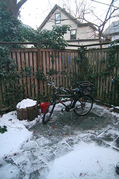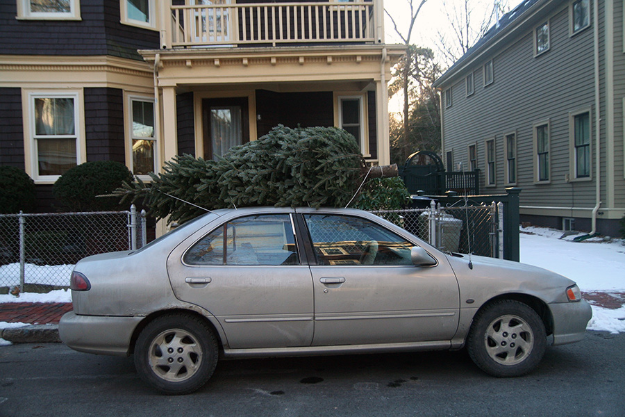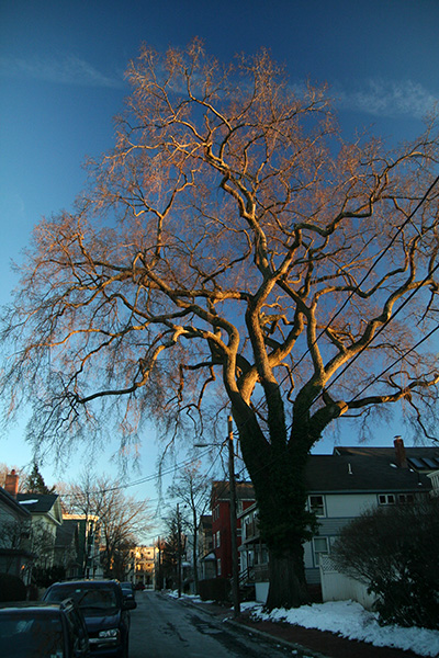 after all that hard work, it didn't seem right if i didn't take the bike out for a spin. it was getting late (meaning it was getting dark) but i decided to head down to the cafe while there was still some daylight. along the way i spotted a car with a christmas tree tied to the roof. isn't it a little too late to be buying a tree now? the car had vermont plates, maybe there's a reason. i also passed by the mega elm tree, all lit up in the late afternoon sun.
