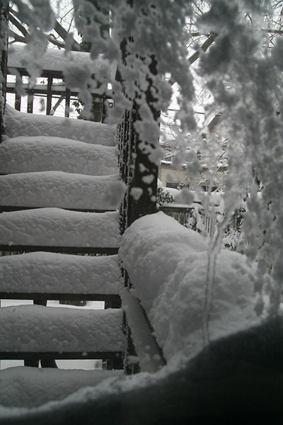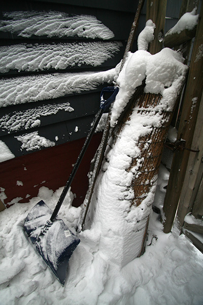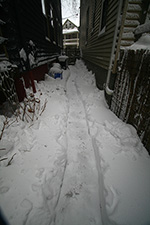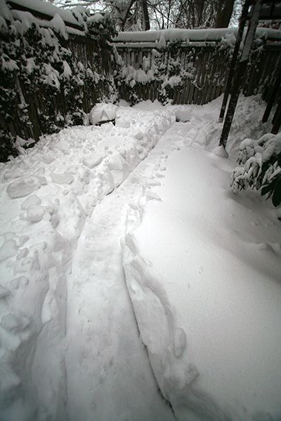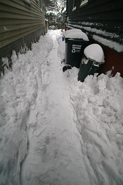 after i was done with the sidewalk, i began digging out a trench into the backyard to the basement so i could gain access to my bicycle when i wanted to use it. there was more snow to shovel but an easier job because i could just pile the snow onto the sides.