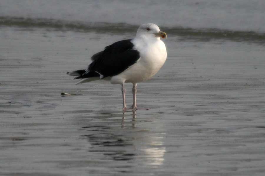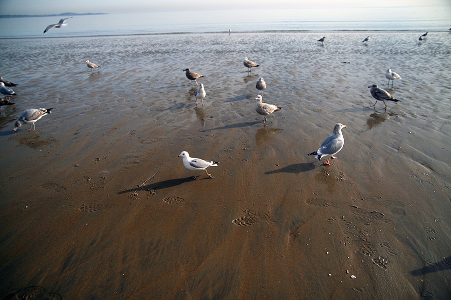 for the most part the gulls were polite but noisy. it wasn't the wild frenzy of flying wings that i'd imagined. they surrounded us but stayed on the ground, fly hopping only to fight for a tossed crumb. most waited patiently, while a few screeched loudly (that was a bad strategy, since throwing a bird tantrum will not get you fed). the majority of the birds were herring gulls, difficult to differentiate from their myriad of plumage variations. they were medium-sized, with pink feet. mixed in with this crowd were smaller ring-billed gulls, black beak ring with yellow feet. off in the distance, one or two great black-backed gulls, the largest of the gulls, and seemingly could've easily overpowered the other gulls, but their strength in physical size was no match for their weakness in numbers, and they didn't get any crumbs because of it.