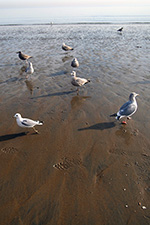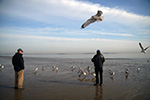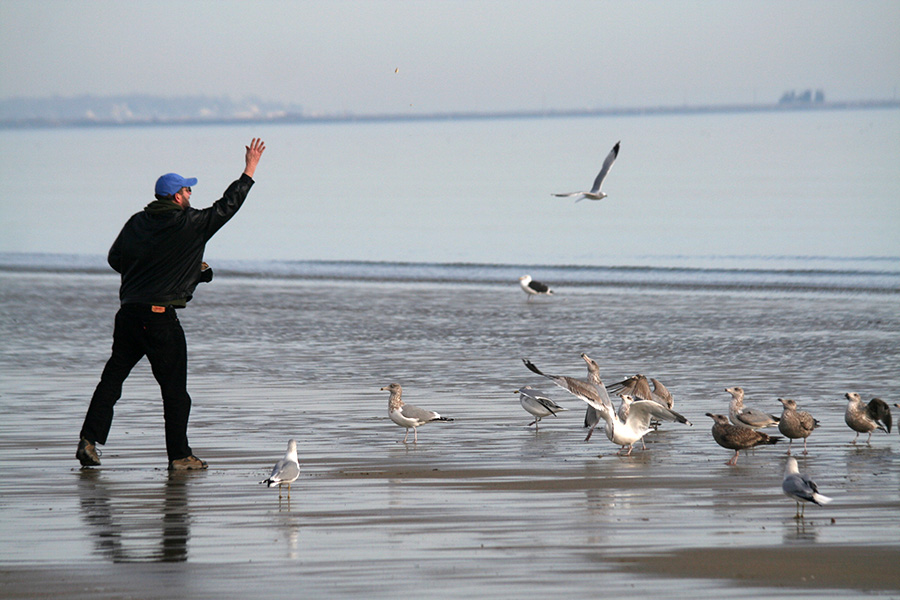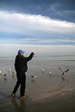 bruce came to the beach with a roll of day-old-expired baguette. wrapped in its paper sleeve, it looked liked he was carrying in a bottle of wine. the bread was naturally to feed the birds, a fun activity bruce thought that would make our beach trip a little more exciting and give me some photo opportunities. we walked north until we were away from most of the civilians before bruce started tossing bread crumbs on the beach. at first there wasn't any seagulls, but as soon as one arrived, the whole flock quickly followed.