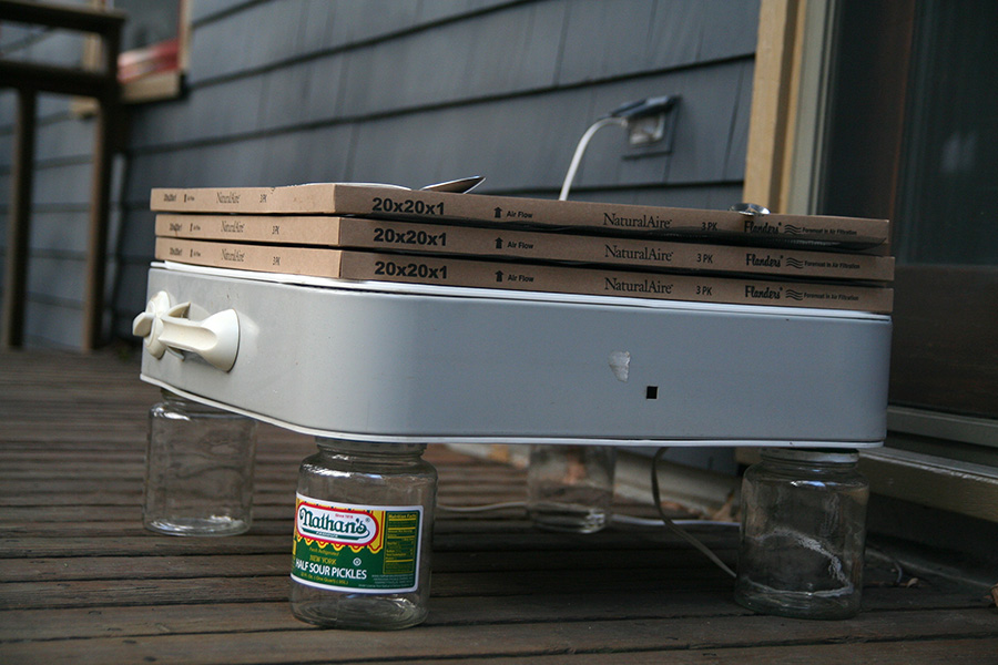 once i had both of my screens full loaded with raw jerky goodness, i brought them into out onto my backyard deck (the sun had barely just risen) and placed them on top of the horizontal box fan balanced on 4 glass pickle jars (i know, very fancy). i set the fan on medium speed (high might be quicker, but it's also too strong and would blow the filters right off), put a few spoons on the filters to keep them from flying away, and then went back inside. time: 7:30. let the dehydration begin!