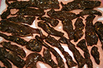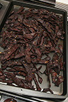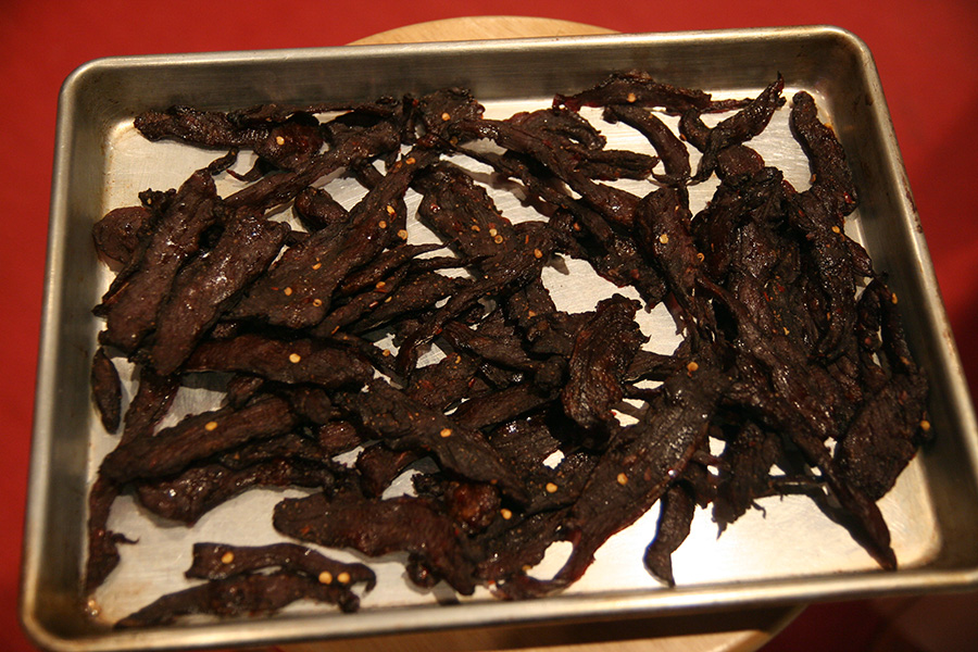so i dumped half of the jerky onto a baking sheet, and the rest onto two separate pizza dishes. i baked everything at around 180°F, not so hot that i couldn't still touch the pan, but low enough that it wouldn't cook the jerky, but just dry them instead. it took about 2 hours before i was satisfied with the jerky texture. the heat also began rendering some of the fat which i wiped up as much as i could with paper towels.