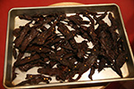 first thing i did was to check that the dehydrator was still functioning and no stray animals - drawn to the smell - had knocked it over. it's nice to be able to run the dehydrator outside. when i did back in september, i ran it indoors (because of the bugs) and it stank up the kitchen with the smell of jerky marinade. i still couldn't get the smoky smell out of my hands despite several washings.