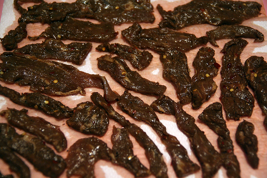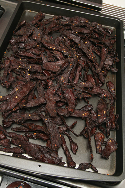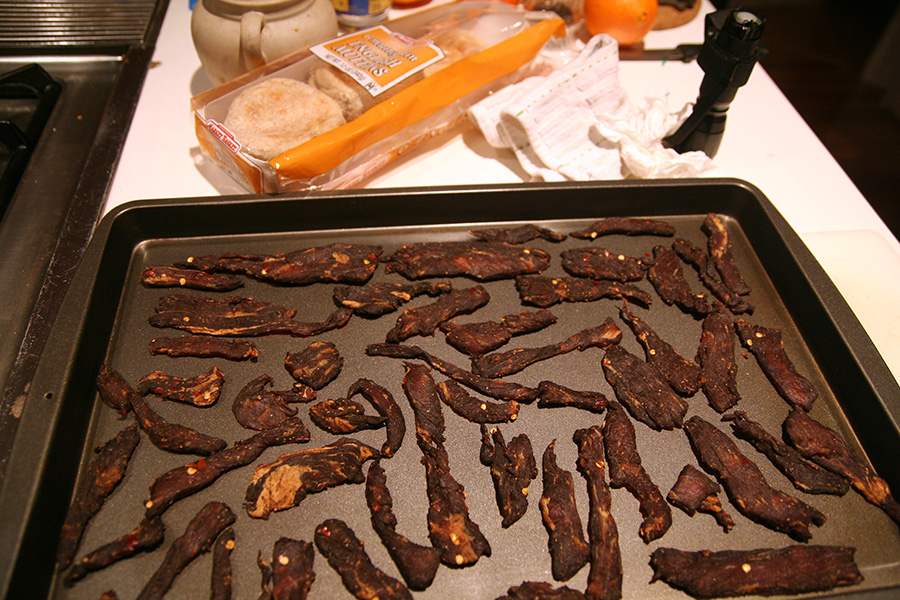 after thinking about it, i decided to move everything inside and continue dehydrating tomorrow. after some additional thinking, i decided to bake the jerky instead. i was afraid if i waited until tomorrow the unfinished jerky would spoil.