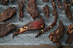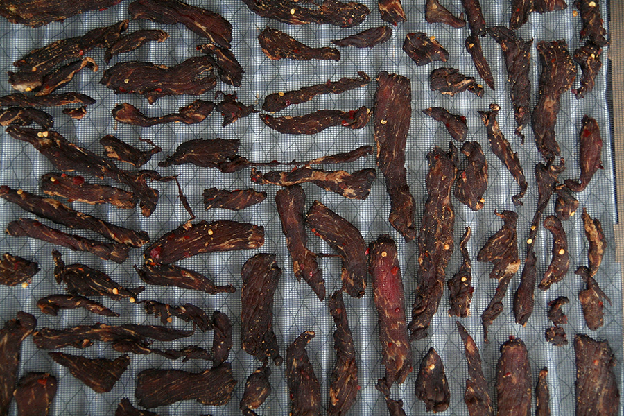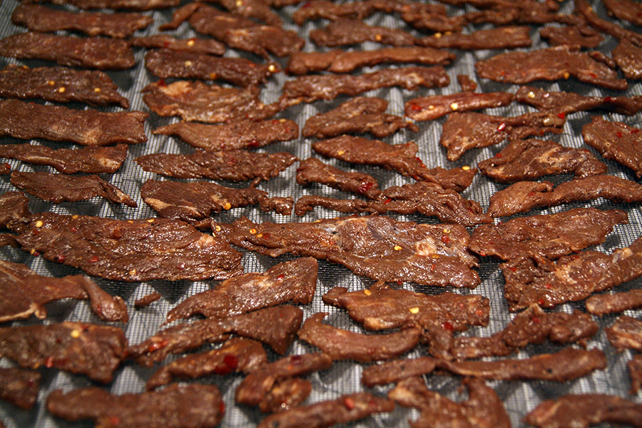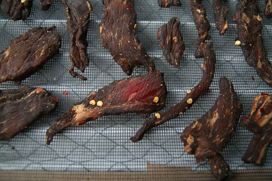 i'm still concerned if i'll be successful with this latest batch of jerky. the problem is the temperature, and whether or not the raw jerky will freeze first instead of properly dehydrating. my last attempt took around 14 hours. at this rate, the jerky won't be done until 10pm. by then the temperature will have dropped below freezing. currently the temperature is a few degrees above freezing, but with my dehydrator facing south, it'll be additionally warmed up by the sun. i'm hoping dehydration this time will be quicker. the last time i did it, i remember it was a humid day, so it took longer for the meat to dry. but now in the midst of winter, with the air so dry, maybe it'll be quicker.