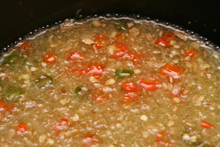 later in the evening i grated about 3 tablespoons worth of fresh ginger, chopped up half a dozen frozen thai chili peppers, and boiled everything in a cup of water plus a cup of sugar.