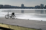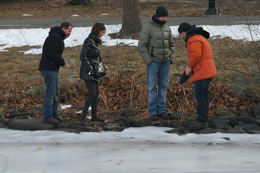 i spotted a group of foreigners goofing around near one of the inner canals along the river. a man held a woman's hand while she walked onto the ice. another man was looking for a large enough boulder to drop onto the frozen surface. he was hesitant to throw the rock while i was watching, but as soon as i left, i heard a loud thud.