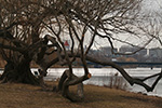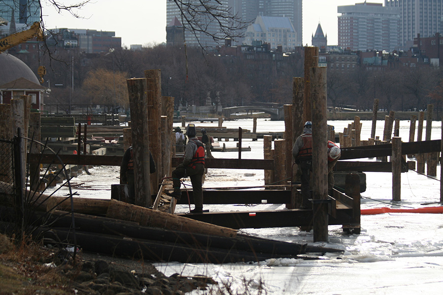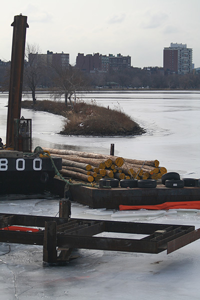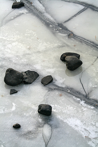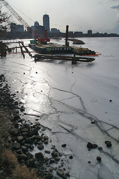 nearby there was construction on a new pier by the river boathouse. i always thought there was no construction during the winter because of the frozen ground. maybe it's different on the water, since only the surface is frozen, while everything below is still diggable. i also noticed large boulders (about the size of a pumpkin) floating on the frozen river, handiwork of people testing to see how solid the ice was.