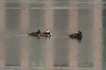 there were birds congregating in the center of the river where it wasn't frozen. mostly gulls, a few canada geese. but i was able to spot a few uncommon birds: hooded mergansers! one male and two females. i've seen hooded mergansers before when i used to go jogging around the charles river (by harvard square). always from a distance, not close enough to get good photos of these rather attractive water birds.