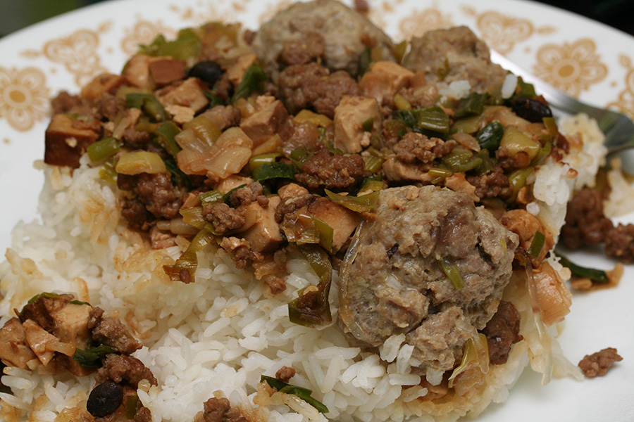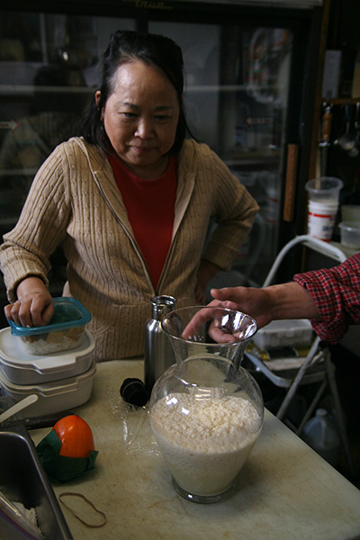 i went directly to the cafe to drop off some haymarket produce items. my parents were making rice wine moonshine using nothing more than cooked glutinous rice and special rice wine yeast. my father was showing me how during the first stage of fermentation the result is a sugary rice pudding dessert, but when allowed to ferment some more it reaches the second stage where the sugar is broken down into alcohol. that gives me all sorts of ideas of making my own alcohol with other ingredients, like potatoes and beets. if it really is this easy to make rice wine, maybe that explains why the stuff is so cheap in china.