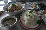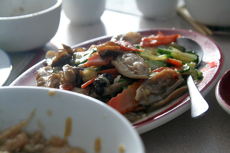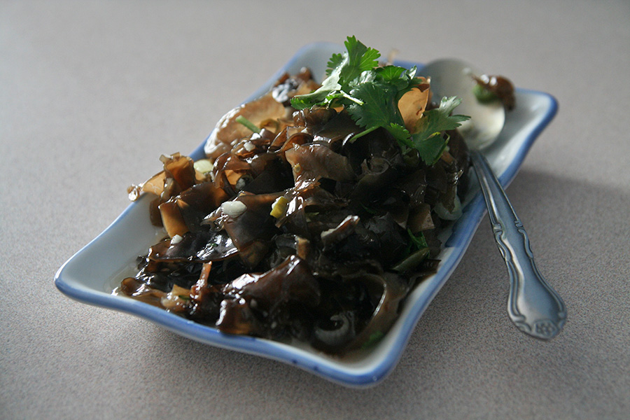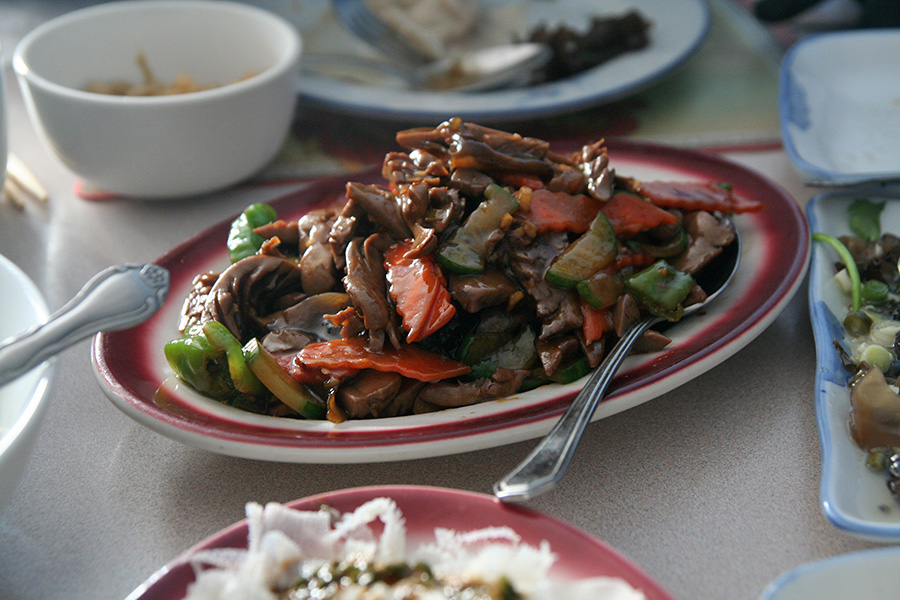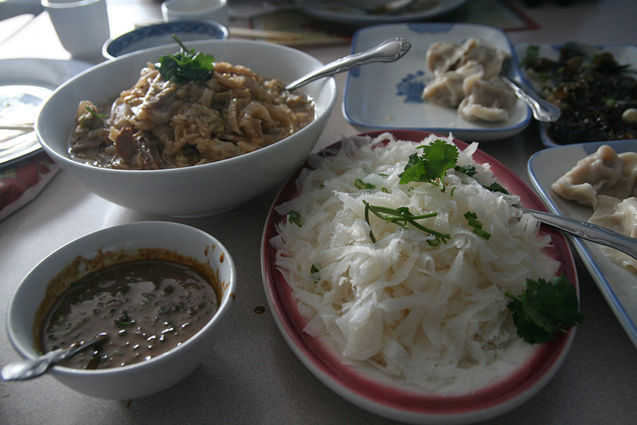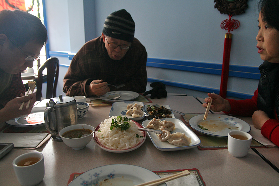 my mother and i met my father and great uncle at the restaurant. we were the first and only customers there on this sunday morning. we chatted with the owner, who's from dongbei, and the waiter (who's actually from kaohsiung, taiwan). from my understanding, dongbei cuisine is about dumplings, and noodles, and sauerkraut (not so much on rice). we ordered two plates of homemade chinese dumplings (one with pork and sauerkraut filling, one with pork and cabbage). we got some wood ear mushrooms for an appetizer, which was the best dish. it didn't look spicy, but the taste was a complex blend of hotness, sourness, and saltiness. the mushrooms were also unusually crispy to the point that i thought maybe i was eating seaweed. we ordered a big bowl of stewed chinese sauerkraut which my great uncle noted wasn't sour enough. i ordered the tripe dish and was surprised when it arrived plain with the sauce on the side (the sauce was similar to kind i make for eating hot pot). the final two dishes were kidneys and intestines. they were okay, but more like traditional american chinese cuisine, a lot of mixed vegetables and thick dark sauces, nothing like the earlier dishes.