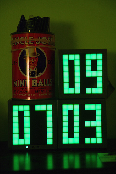 the time is arranged into 3 separate glowing green cubes (connected by computer ribbon cables) that can either be stacked or arranged horizontally. the numbers are pretty big and bright. originally i thought i'd place the clock on top of the tv,