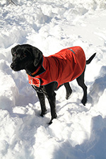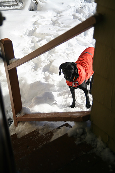 afterwards she wouldn't come back inside, but would wait at the bottom of the staircase. either she wanted to continue playing in the snow - or she was probably waiting for us to bribe her with a dog treat. she finally did come inside but was restless until we realized she needed to go to the bathroom (i guess the excitement of the snow made her forget to do her business).
