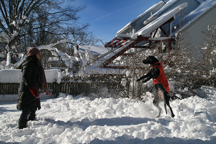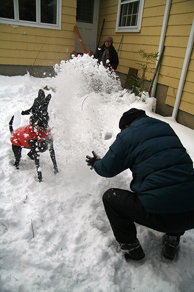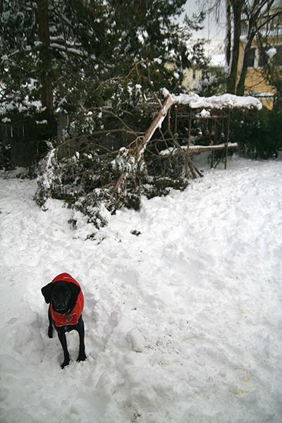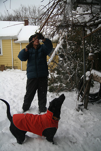 i was dismayed to discover that nobody had taken care of the shrubs and the trees, and how some of them were crushed by the weight of the snow. i went out with a broom handle to free the plants (quince, lilacs, bamboos, arborvitae). my sister helped out as well, while hailey - dressed in her winter garb - hovered around, waiting for us to throw snow at her so she can catch it.