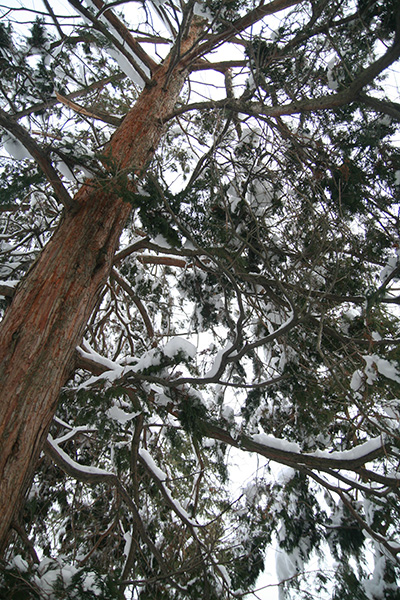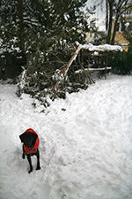 when my father came home we moved the broken tree trunk of the backyard pine tree that had snapped in half during the blizzard. we were lucky that it didn't crash into the fence, or fall into the neighbor's yard, or even damage the house. i don't really know what kind of tree it is, maybe a lawson cypress. the old lady who lived next door apparently knew, and even asked for some branches many years ago when she was making a floral display (she's since passed away i think). it was a fairly tall tree, but my father said it already had a crack in the trunk which contributed to the snapping.