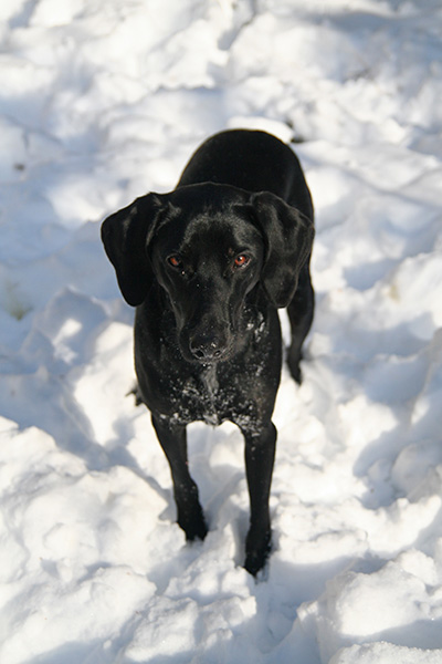 so i couldn't get her to come back inside. whenever i got close enough to grab her, she'd run away. i don't like bribing her with food (which sets a bad example) so instead i was making loud noises to attract her back inside. kicking some snow seems to draw her near, but as soon as i reached out she'd run away again. i finally got her back by tricking her with her favorite toy. she seemed super restless inside the house, so the third time i took her outside but on a leash. turns out she needed to make number 2 and willingly came back inside afterwards. from that point on she was calm and went to sleep.
