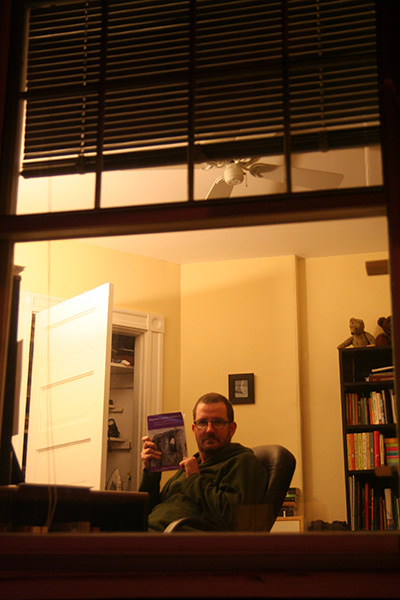 in the evening i left the house once more for a lecture at the harvard museum of natural history titled "heads up! how and why the amazing human head evolved to be the way it is" by daniel lieberman. earlier a reminder e-mail was set out informing people that the lecture would go according to schedule despite the snow. walking down my street, i caught bruce in his study window reading a book.
