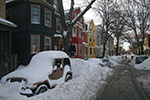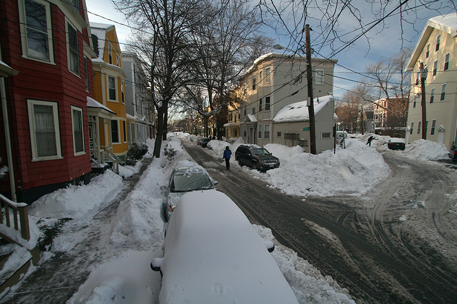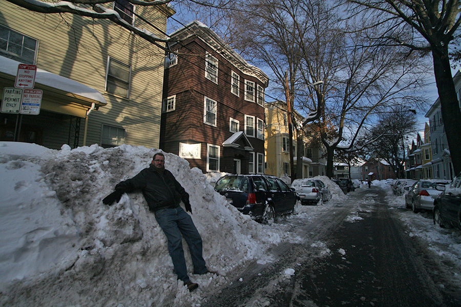 i got together with bruce so he could help me take some photos of myself climbing on one of the giant snow mounds dotting the neighborhood, for the sake of posterity. i thought it'd be solid, but the topmost layer was still soft due to the 8" of snowfall that fell overnight. the view from on top of the snowy plateau was pretty spectacular, like a bird's eye view down the street.