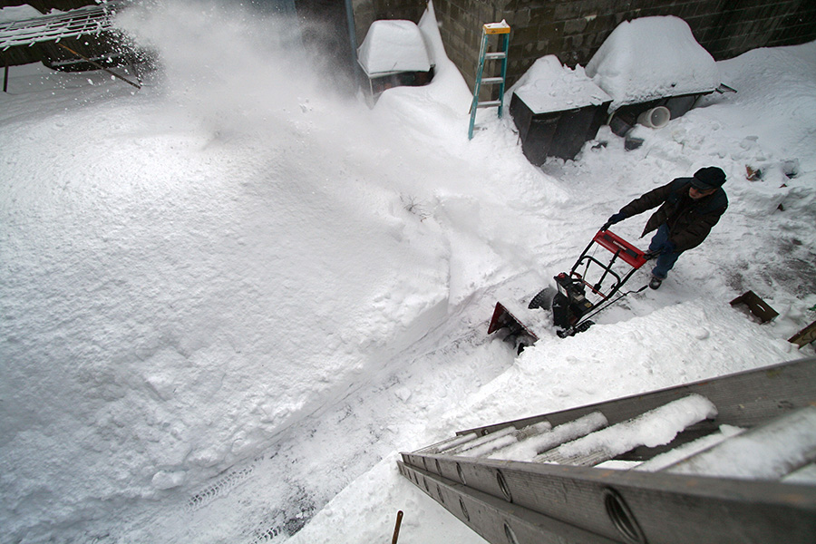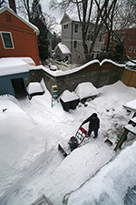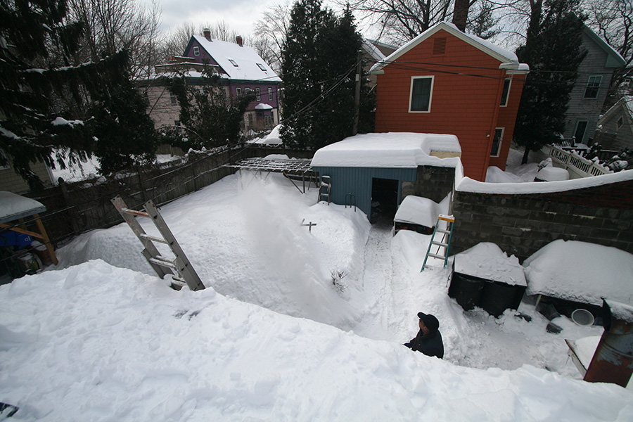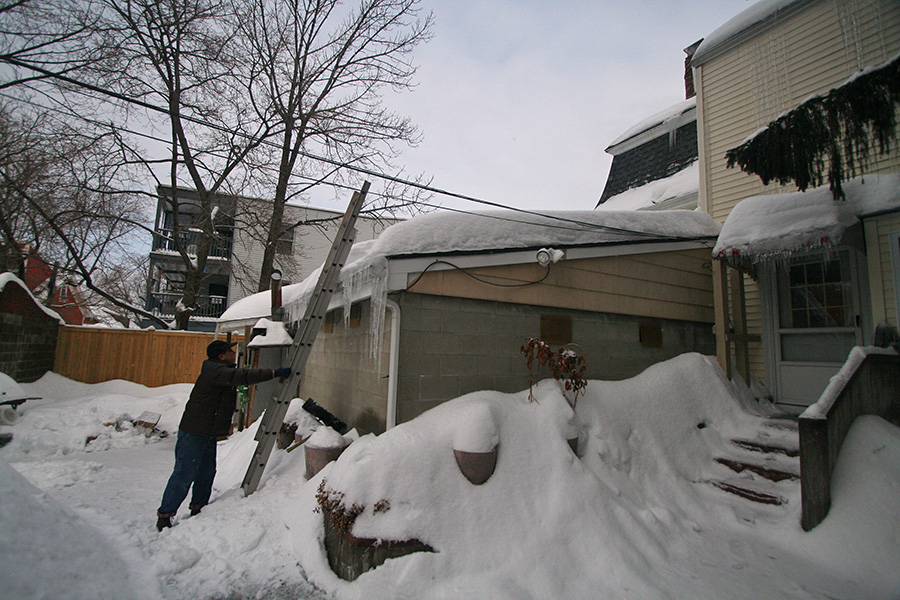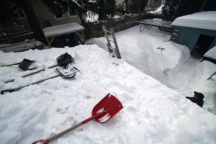 i shoveled for about an hour, successively opening up one jacket layer after another. my eyes started to hurt from staring at the blinding whiteness. i threw the snow over the side of the roof, where later my father cleaned it up with a snowblower. when it finally came time for me to get down, i was tempted to jump off the roof and onto the big snow pile nearby, but decided against it because i knew there were some wooden stakes buried below.