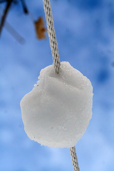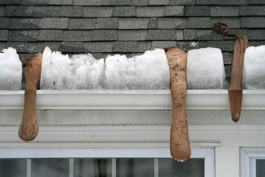 arriving at my parents' place, i noticed these brownish sausage things hanging down from their next door neighbor's roof. it took me a second to realize these were the ice melt socks i've been reading about! they seemed to be really working, cutting through the ice dams in the gutters, but the ice melt pellets inside the pantyhose have shifted and now they're just drooping from the gutters. another thing they failed to do is to attach a length of rope so they can use it to re-adjust the position or bring down the sock without a ladder.