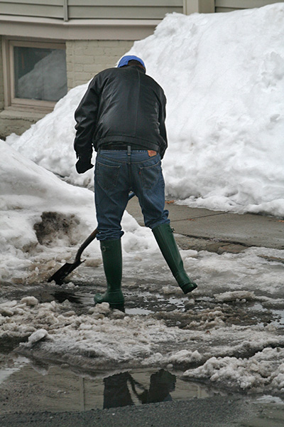 i left the house briefly when i saw bruce (sporting his new rubber boots) digging out a canal for the melt water to the storm drain. it was raining late last night and all this morning. by the afternoon the rain had stopped but the temperature suddenly took a nose dive. i was worried about my bike which was still parked outside; i don't want it to get encased in ice because i need to ride it tomorrow (grocery run).