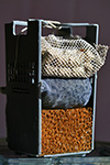 first, i had to scrub off the algae from the glass. next, siphon out a bucket's worth of dirty aquarium water. it's been a while since i cleaned out the filter so i did that too. i threw out the old activated carbon and poured in some new ones (the crackling sound meant it was working). once the assembled filter was back in the aquarium, i began adding the clean water, which has been sitting in a nearby cistern. the external water supply allows me to treat the water beforehand (get rid of the chlorine that they add to the tap water) and to make sure the water is at room temperature (water from the tap is too cold and the shock might kill the fish).