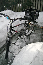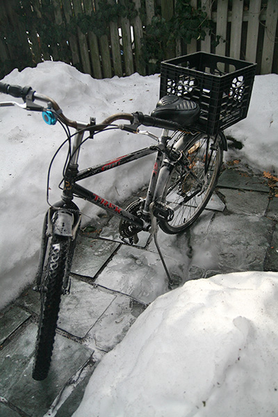 since the weather was so warm, it was the perfect time to wash the bike. the only problem was there wasn't a lot of space in the backyard. i still managed, first wiping down the bike with a wet sponge, then spraying with the simple green foaming cleanser, and finally wiping down the bike one last time (normally this would all be done with the spray hose, but the faucet is still off for the winter). i locked the bike around one of the deck posts figuring i might want to use it tomorrow (another warm day, temperature might sore to the 60's).