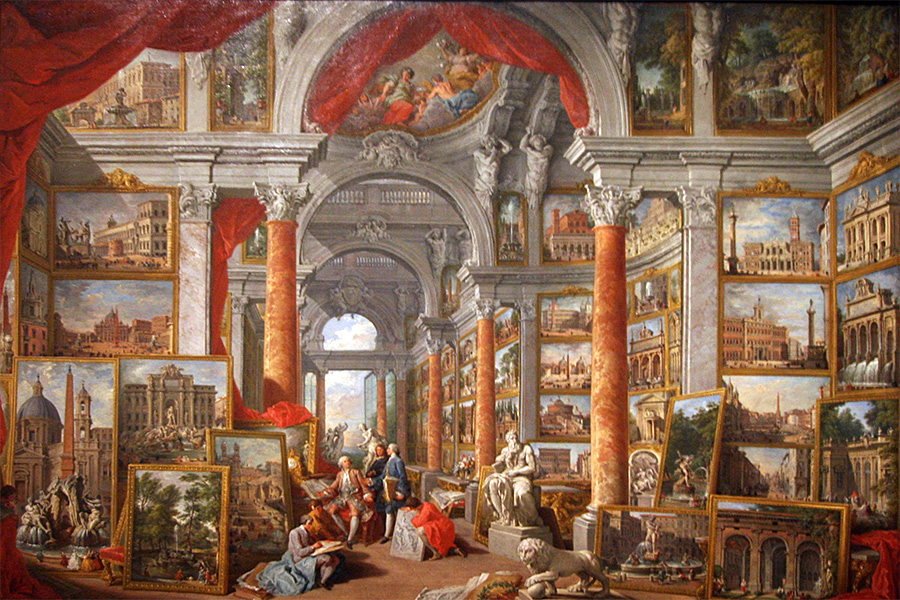 i think one of the things he was most impressed with was the 1757 painting by italian gioanni paolo pannini, the paintings within a painting. having been to rome, he testified to the accuracy of the roman landmarks featured in the various miniature depictions.