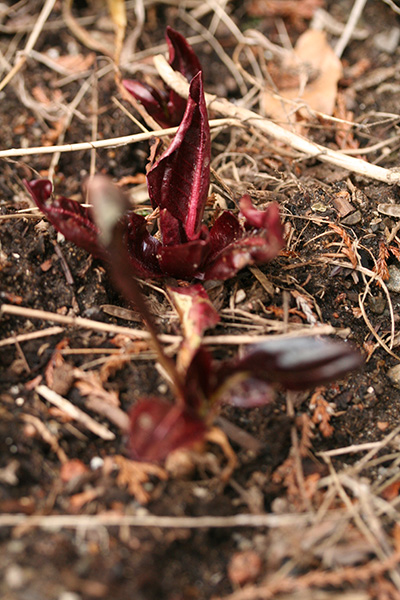 some mysterious green perennials have sprouted in the garden area next to the faucet. i did a quick check of my records from last year and i don't know what they could be. whatever it is, there are 3 clumps. they've emerged so early, they'll probably flower soon too so i'll be able to figure out what they are.