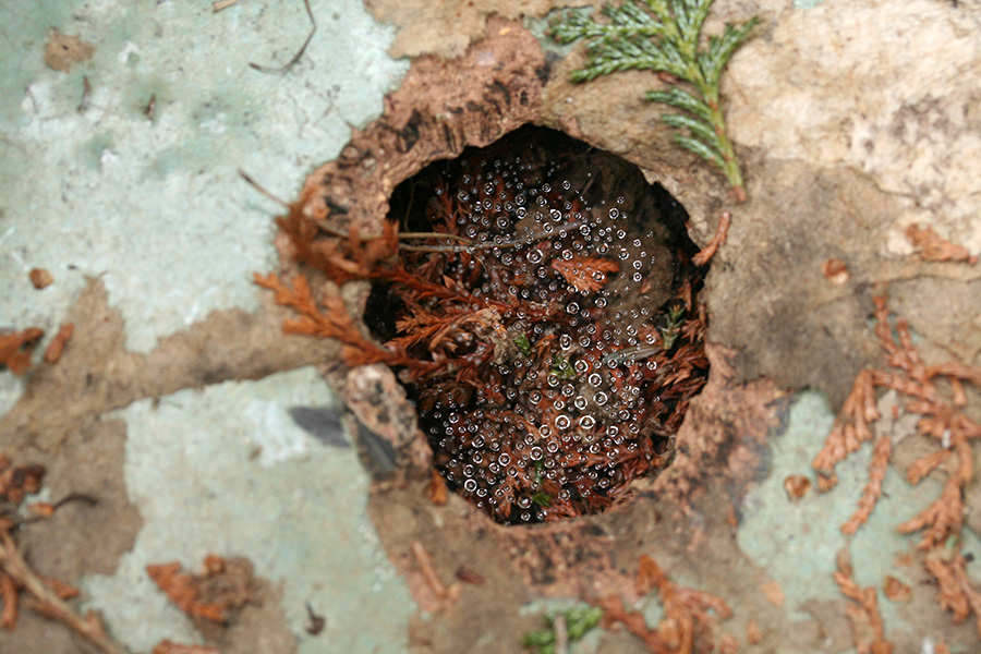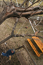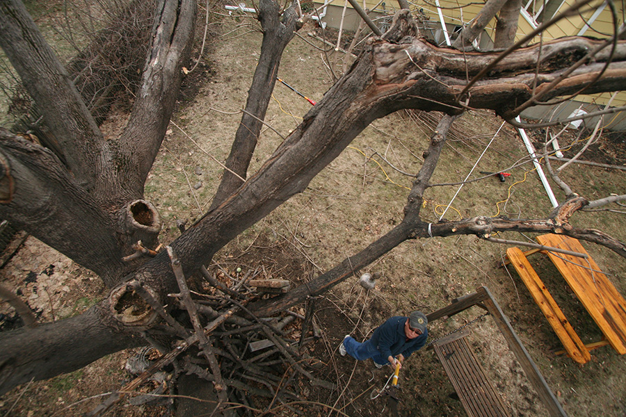 up on the tree with a ladder, it was clearly evident how bad a shape it was, with rotting overhead stumps and large branches with wounds that never healed. not much to look at at this point, but once the leaves come out everything will be hidden from view. the tree is very much diseased, which explains the rampant powdery mildew the past few years. it really should be put out of its misery, and in its place, a few flowering fruit trees (that was the original idea back in 2009).