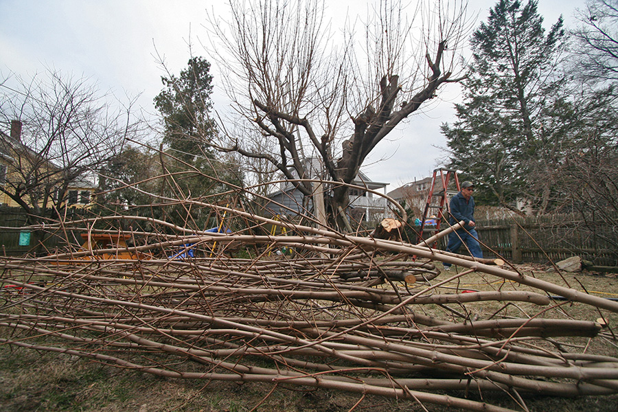 we finally stopped pruning by 6:00 (dinner time), even though it was still daylight outside. the tree still needs another pass, probably with a pair of loppers. hopefully we can get that done before it begins to flower.