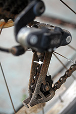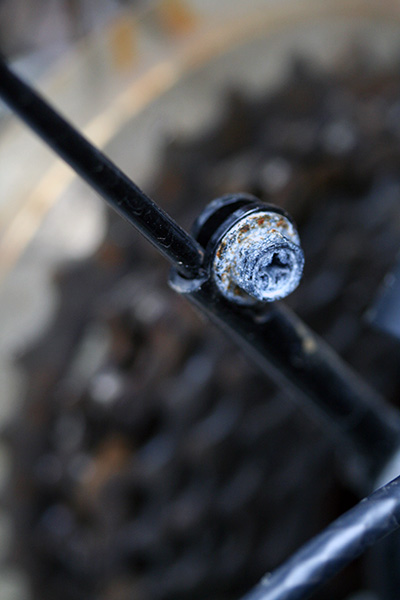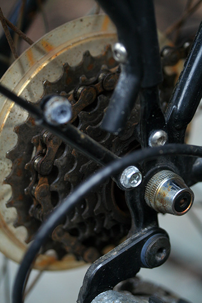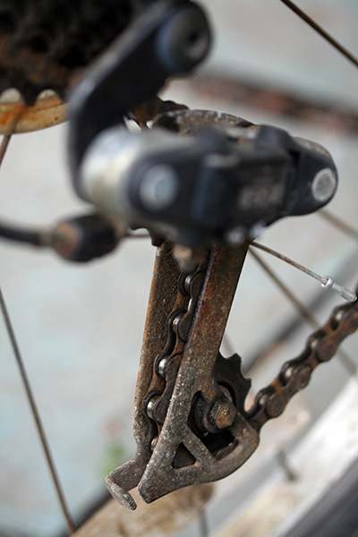 back at home i wheeled the bike into the backyard to fix a few issues. the past 2 days it's been squeaking something awful. it seemed to be coming from the bottom bracket between the pedals. or maybe wet brake shoes were rubbing against the rims. then today there was the addition of a grinding sound. pieces of gravel caught in the brake pads? i oiled the chain first, which looked dry and rusty.
