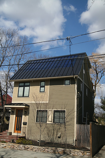 returning to the cafe from fresh pond, i traveled down field street. i noticed a newly construction house (18 field street) with metal roofs like you'd see in vermont. while riding pass the house, i noticed they weren't just roofs - they were also solar panels! i stopped to get a photo, just when the owner came out of the house. he told me not only were they for electricity, but they also heated the water as well. what an awesome house!