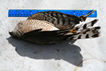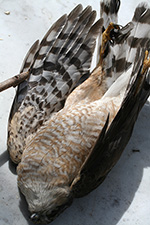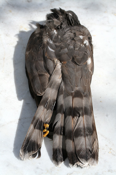 from the photo my sister sent me, i knew it was either a cooper's hawk or a sharp-shinned hawk ("sharpie"). even though they're pretty common, i've only seen them a few times, and rarely close enough for photos. these two hawks are very similar in appearance and i couldn't make a positive identification from my sister's snapshot. after examining the dead bird up close, it's safe to say it was a sharp-shinned hawk. they're smaller (average a foot in length), have a compact head, and the tail feathers are equally long.