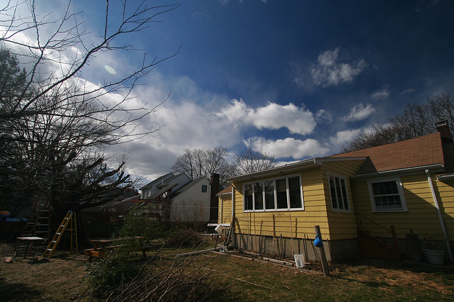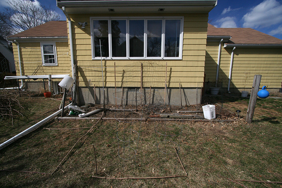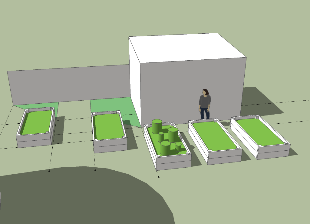 my father and i examined possible layouts for the raised beds. he wants about 2 feet of mulch around the perimeter of the house, placed on top of a permeable fabric barrier. i'm of the opinion that it wouldn't do any good and given a heavy spring soaking the basement could very well flood again. irregardless, we played hypothetical, outlining the borders of the beds with the surplus of tree branches. we settled on a possibility of 5 boxes, 4'x8'x20". furnished with a list of measured dimensions, later i used my newfound sketchup skills to good use and drew a mockup of the layout. i was trying to impress my father with how easy the program was and hoping he'd want to try it out himself. one of the more useful features is the shadow function: after locating our position on google map, the application could then simulate the shadow conditions on any given date and time. we played with the arrangement to make sure none of the raised beds would be in the shadows throughout the day.