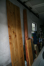 the weather this morning was a clear blue sky (although a bit windy), but by afternoon the sky became overcast. it looked like it'd rain and sure enough it started to drizzle while we were finishing up. we quickly moved the newly finished boards into the garage to dry.