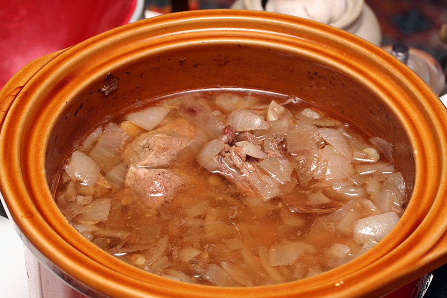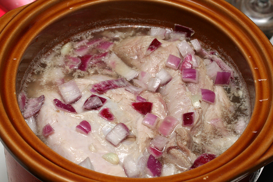 i filled the pot with enough water to cover up the chopped pieces of pork. i set the crockpot on high and went away to watch television while the pork slowly cooked.