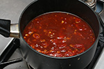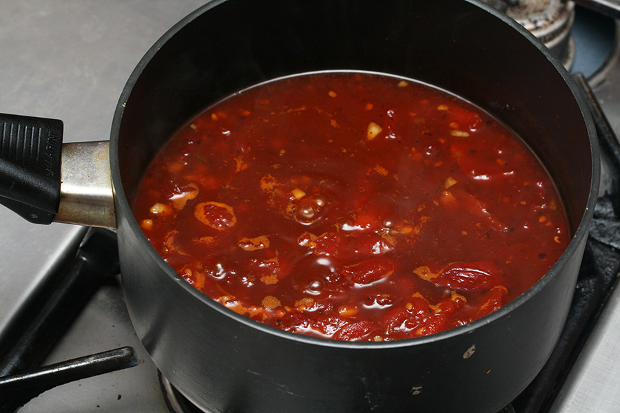 this particular combination of ingredients creates a sauce that is at the same time sweet and salty, spicy and sour, and even a touch of bitterness. my first mistake was using stewed tomatoes instead of actual tomato sauce. the end result was a chunky stew instead of a normal sauce. my second mistake i wouldn't find out until later: i didn't make enough sauce. i simmered it for about 30+ minutes, making about 2 cups of usable sauce.