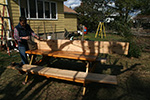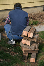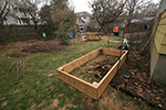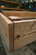 when my father came back home in the afternoon (after my mother left for work), we started assembling our first raised bed. we still needed corner posts which we created by cutting two 8' long cedar 4x4" into foot long segments. my father has a small circular saw but it can only cut less than 2" deep. even with top-to-bottom cutting, the pieces still wouldn't break, so we had to finish them off with a pruning saw. that resulted in posts with uneven ends, which i think gives our raised bed a handcrafted flavor.