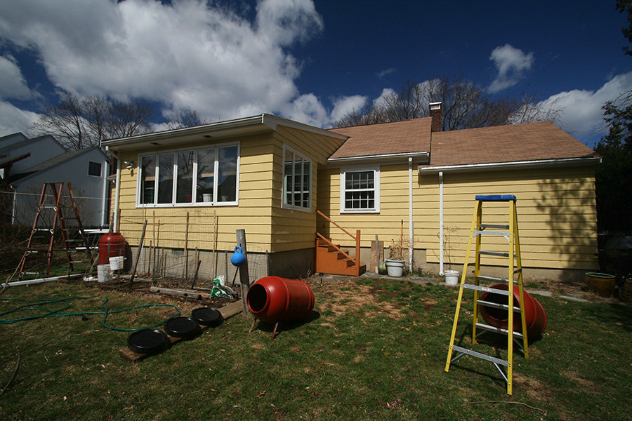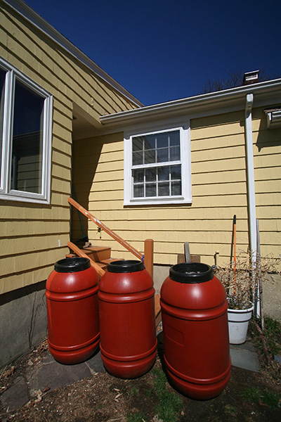 we arrived in haverhill 30 minutes ahead of schedule. we were expecting some sort of industrial park but instead found a quiet residential house. the blue plastic rain barrel sitting out by the front yard was evidence we were at the right place. i rang the doorbell but nobody answered. a neighbor throwing out his trash saw us. "you guys looking for russ?" he asked, then redirected us to the back of the house, past a driveway lined with metal barrels, to a wooden shack sitting in a gravel-filled yard. i knocked on the door and waited. behind a shed we spotted a stack of blue plastic barrels. moments later russ stepped out of his house. a grizzled looking but nice man, he showed us to the plastic barrels, warning us to the various dog droppings dotting the yard. the barrels he took out were not the ones i was expecting: these were reddish brown in color, with a mason-jar-style screw on top. i was looking forward to the blues, but the reddish-browns would be easier to blend in with the house.