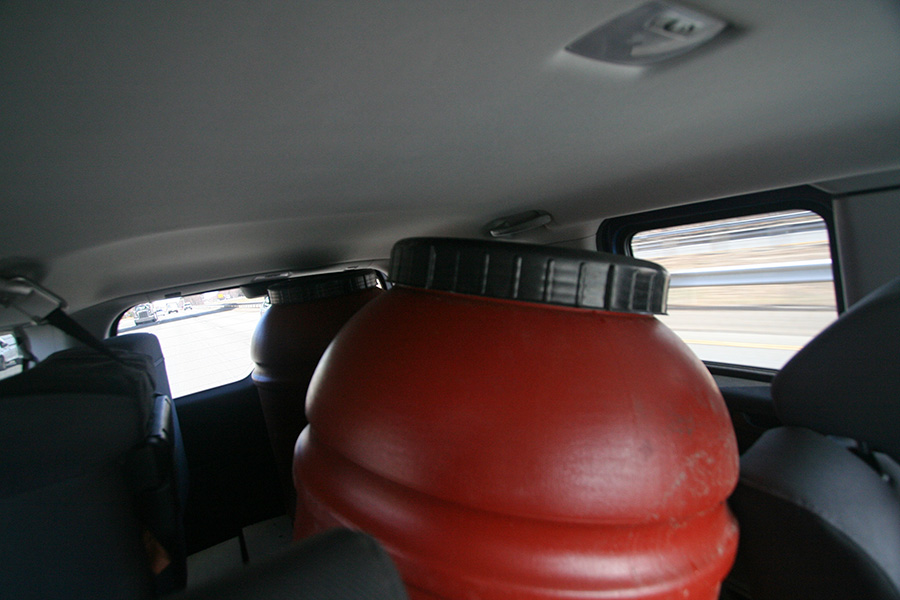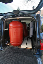 so we ended up getting 3 reddish-brown barrels. at $20 a piece, they were still cheaper than what we would've gotten in rockland. these were a better version as well, with removable lids for easy cleaning and spigot installation. my father pulled the car up to the driveway while i paid russ. "i don't think you'll be able to fit all these barrels into the car," he said. but once he helped us load them into the back, he saw otherwise. "this is a great car," he said, admiring the roomy interior despite outward appearance.