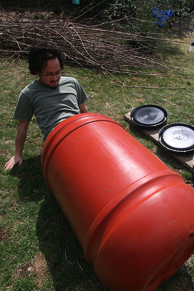 it was a little smelly, a mixture between skunky beer and spoiled milk. i rinsed them out with a hose and opened them up to be air dried. later i crawled inside just to see if i could do it. my sister thought it'd be fun to roll the barrel. even though i only traveled a few feet, i actually got a bit motion sick.