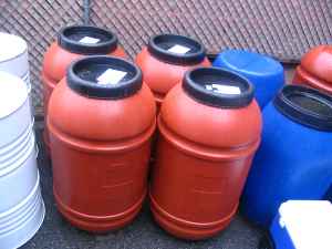 i blinked. $25? "i thought the ad said $15?" russ said he put up two postings; the blues are $15, but these reddish brown versions are $25. he then showed us to one of the blues. these weren't as good, with a fused lid making it hard to clean inside. also, he didn't have anymore blue barrels left anyway (besides the ones behind the shed, which i didn't mention). he gets them from his brother and he won't be getting a new shipment until a few days. he saw my father and i hesitating. "tell you what. i'll sell those red ones to guys for $20 a piece."