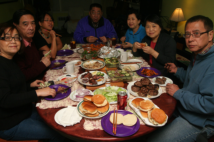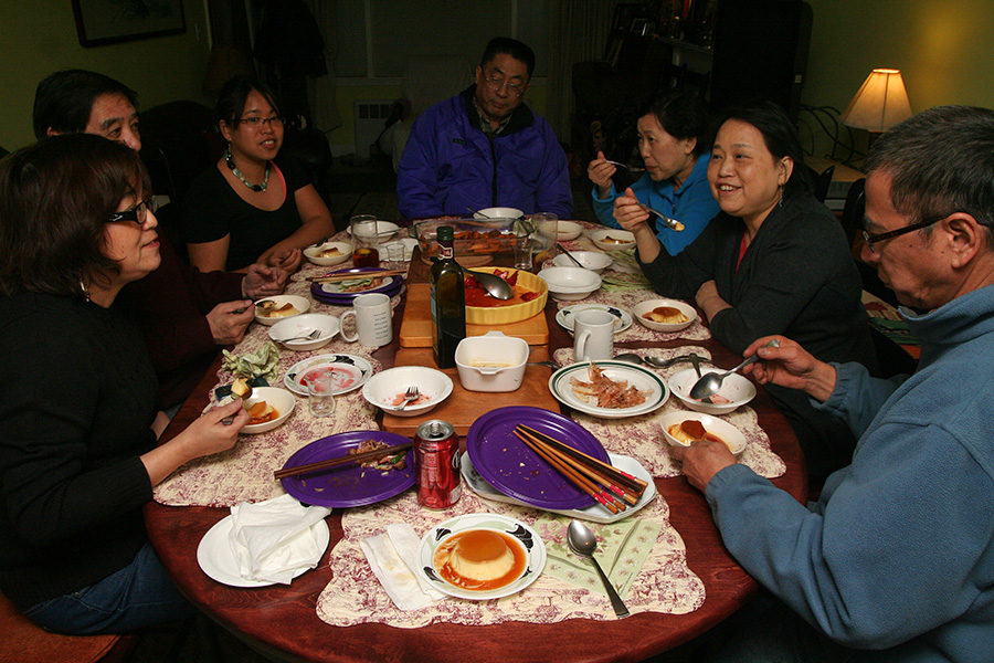 after closing up the cafe, everyone arrived at my parents' place. so who are these aunts? they're my mother's sisters. my 2nd aunt is my mother's older sister, who also works at the cafe. i call her my 2nd aunt because she wasn't my oldest aunt (she's still in taiwan, i called her my big aunt), nor was she my youngest aunt (that's my little aunt, who's the one visiting from california). my 2nd aunt came her with husband whom i call my 2nd uncle. my little aunt i've actually seen recently, a few years ago when i went to san francisco and drove to freemont to visit her for lunch. she came to boston with her husband whom i call my little uncle.