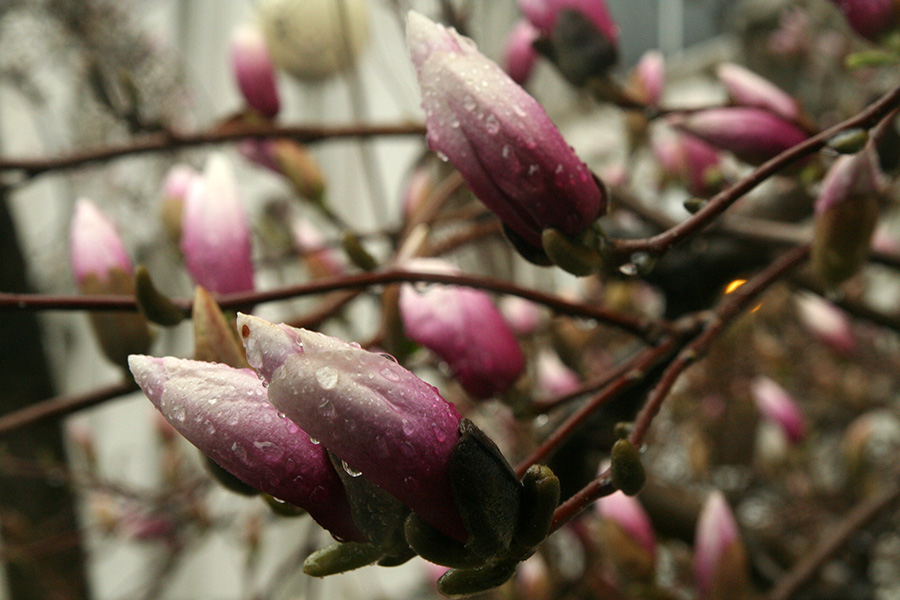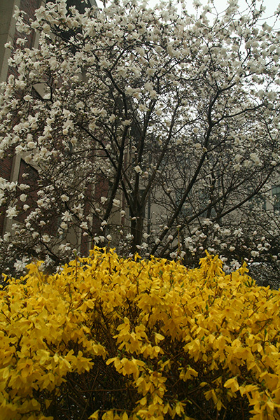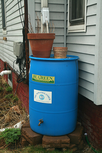 it continued to rain. after depositing a check at my bank, i began walking home. despite being cold and wet, i could still admire some of the trees and shrubs that are now beginning to flower, plants like forsythias and magnolias. spring signs! i decided to visit harrison street in nearby somerville to see some rain barrels in action.