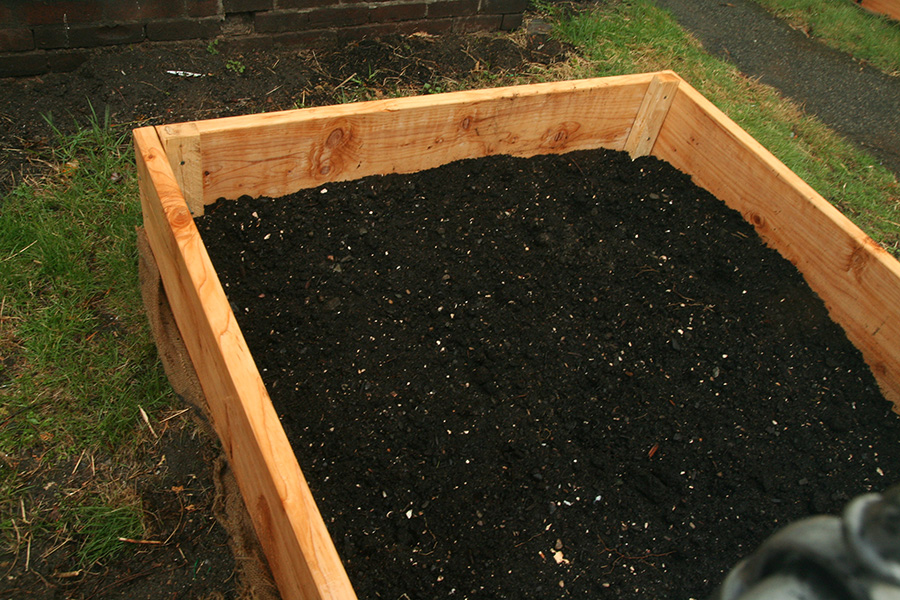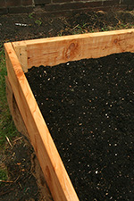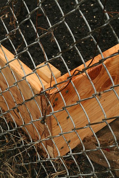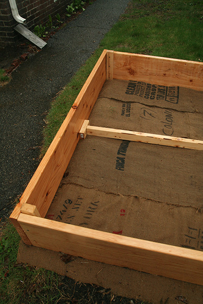 there was also some homemade raised beds on the front yard of somebody's house. everyone builds them differently, although the basic plan is the same. these were smaller frames, and i wondered if the builder treated the wood with linseed oil like we did because the boards seems water-resistant. despite some crude corners (6 nails? 3 nails? misalignment?), the larger box was fancy enough to have a center brace and the bottoms where lined with burlap.