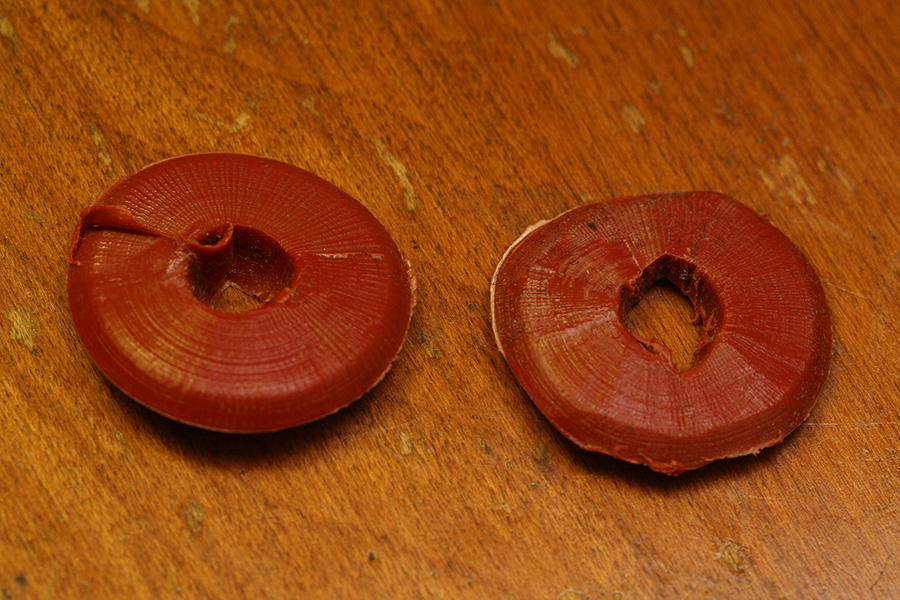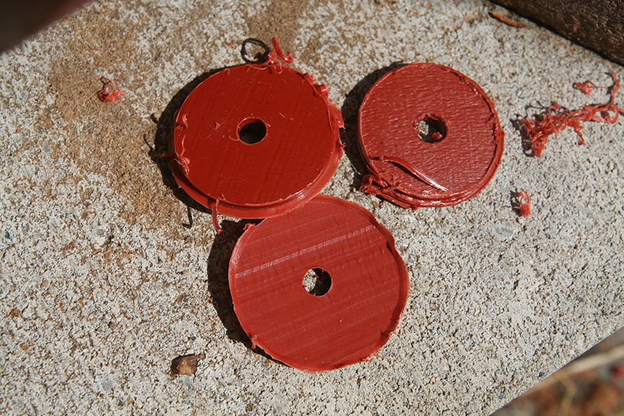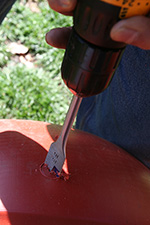 for the 3/4" spigot holes we used a 15/16" drill bit. 15/16" is the correct size, but in our first attempt my father didn't have the bit centered and was going too fast so it carved out a slightly lop-sized hole that he later had to file to size with the rat-tail again. the second one we went slow and made sure the teeth made good contact; this hole was perfect.