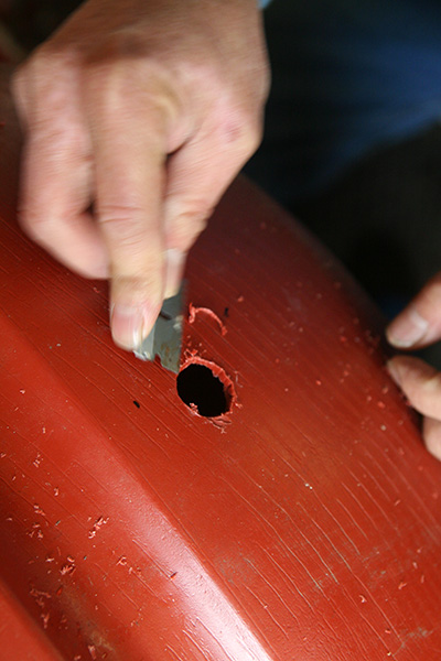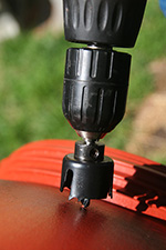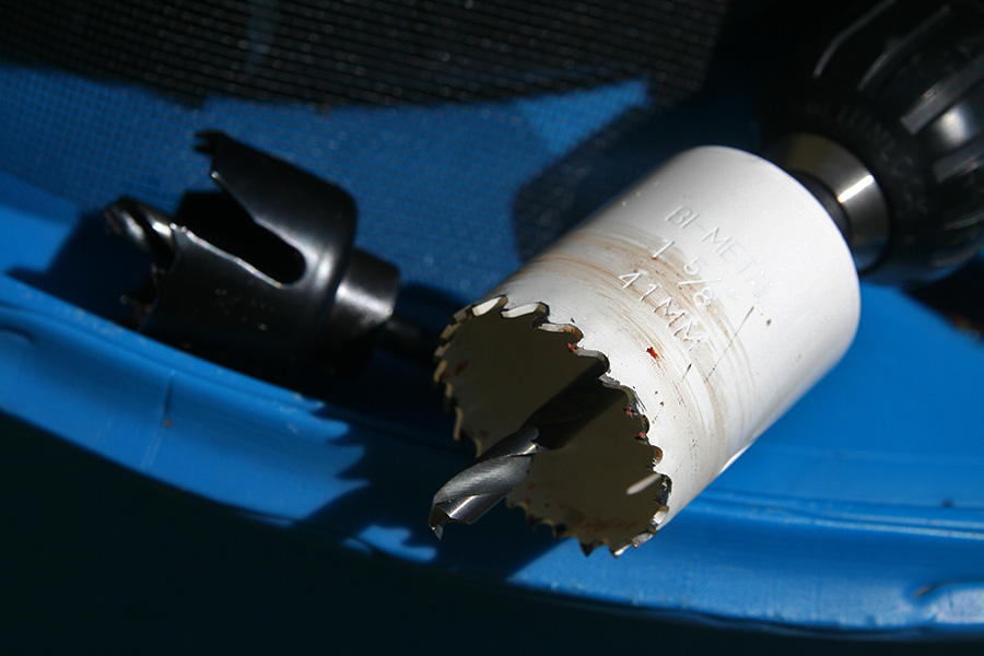with a 1-1/2" drill bit my father made a hole for the 1-1/4" elbowed insert fitting. we immediately realized that 1-1/2" is actually still too small a diameter to fit the 1-1/4" male terminal end. so we ended up filing away the edge of the hole with a rat-tail file to get the proper size.